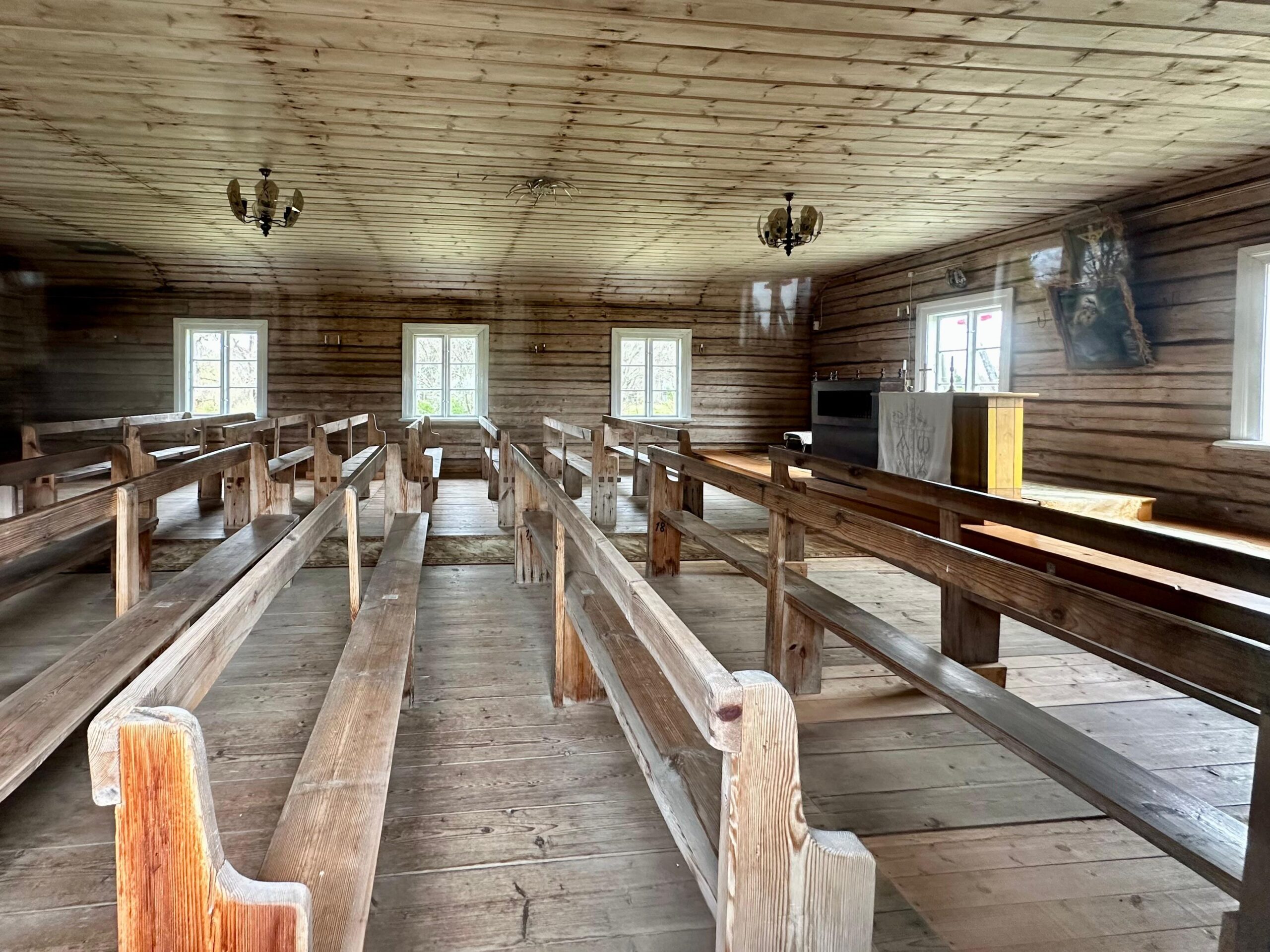 - Hoones on 11 akent, originaaluksed ja üle 100 aasta vanused laternad. Kõrgendatud osas asuvad kantsel, pikad puidust pingid jumalateenistusel osalejatele, harmoonium ja kaks altarimaali.