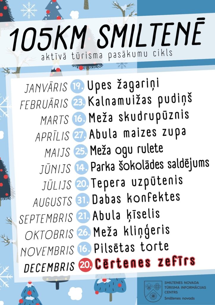 🎄 20. decembrī norisināsies pārgājiens “Cērtenes zefīrs”, kas būs noslēdzošais posms aktīvā tūrisma pasākumu cikla “105km Smiltenē” ietvaros. Visa gada garumā dalībnieki katru mēnesi devās dažāda garuma distancēs, lai kopā noietu 105 kilometrus. Šoreiz tiks mēroti atlikušie 4 kilometri, līdz ar to pārgājiens būs īpaši draudzīgs ģimenēm ar bērniem. Ceļā sagaidāmi pārsteigumi, un kas to lai zin – varbūt pat Ziemassvētku vecītis un viņa ziemeļbrieži!