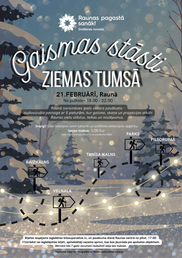 21. februārī, no pulksten 18.00-22.00 Raunā norisināsies īpašs vakara pasākums “Gaismas stāsti ziemas tumsā” – audiovizuāla pastaiga, kur gaisma, skaņa un projekcijas atklās Raunas vietu stāstus, teikas un noslēpumus. Pastaigas maršrutā būs pieci pieturas punkti – Baižkalna muižas ēka un pagalms, Velnala, Tanīsa kalns, Raunas pilsdrupas un Raunas parks, kas apmeklētājiem parādīsies citādā gaismā kā ierasts. Stāsti nebūs savstarpēji saistīti kopīgā sižetā, taču katra maršruta pietura atklās vienu stāstu vai noskaņu, un kopā tie veidos vienotu audiovizuālu ceļojumu cauri Raunai ziemas tumsā.