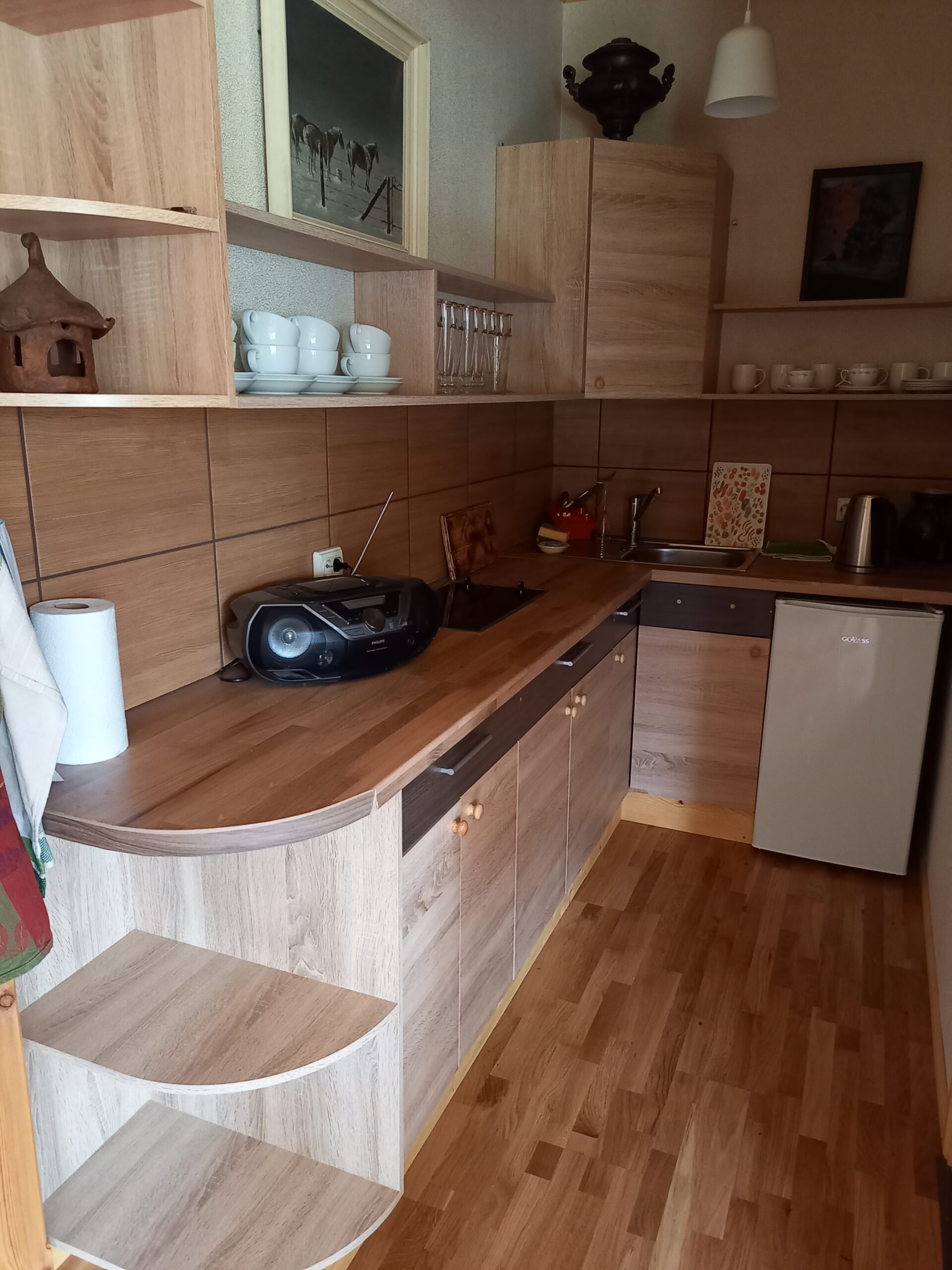 • Aprīkota virtuve  (ledusskapis, plīts, tējkanna, virtuves piederumi).
