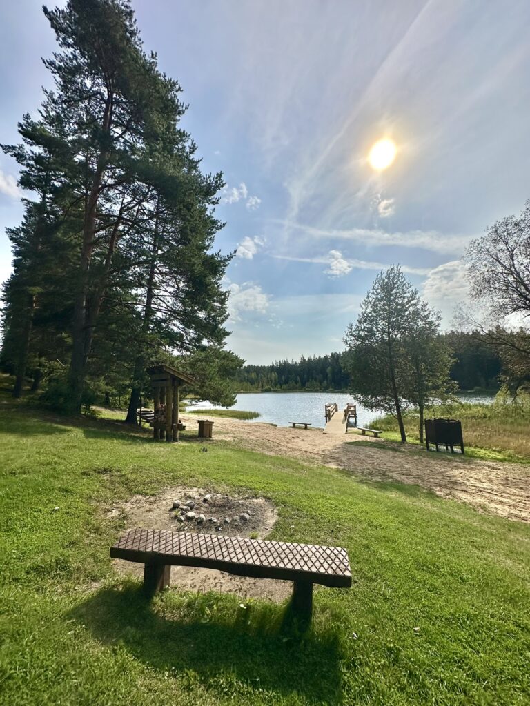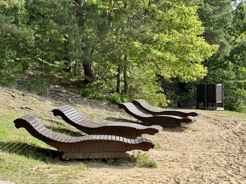 - Ezera krastā novietoti četri zviļņi jeb koka gultas, kurās var gulēt un sauļoties.