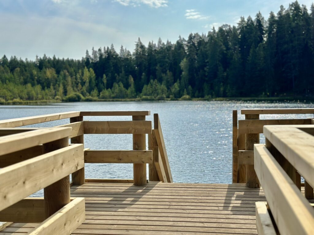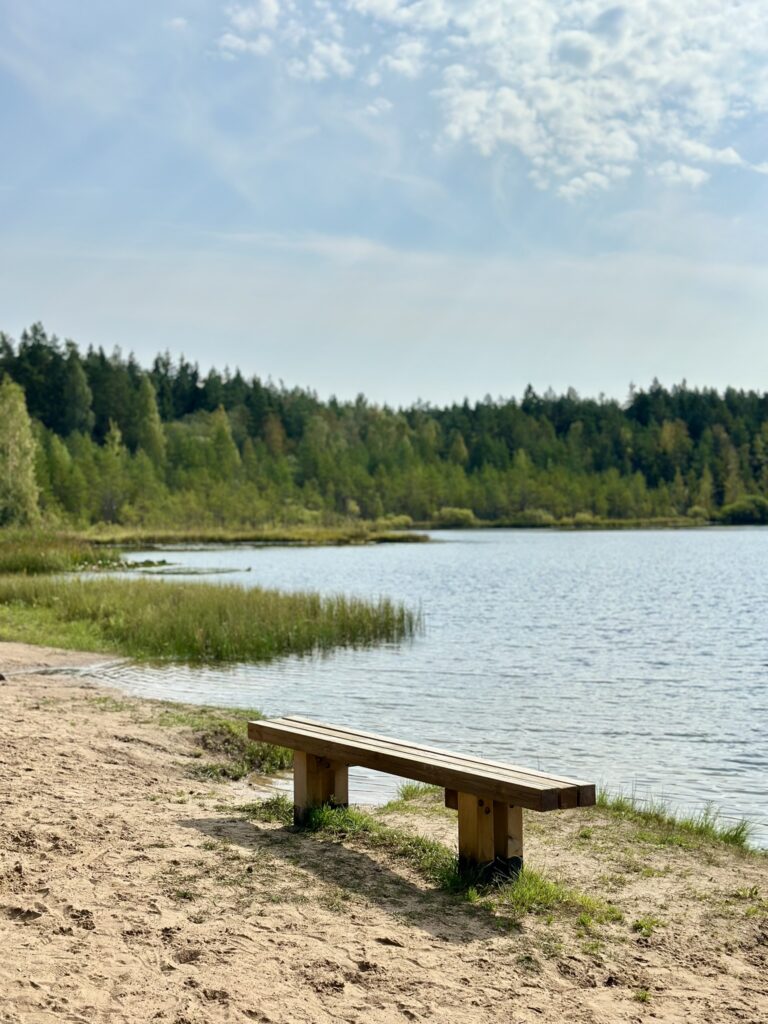 - Klievezerā ir uzbūvēta koka laipa ar soliņu galā.