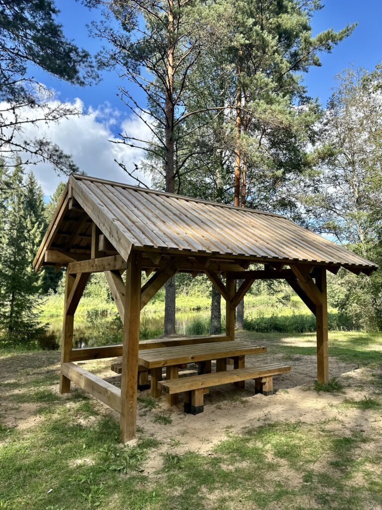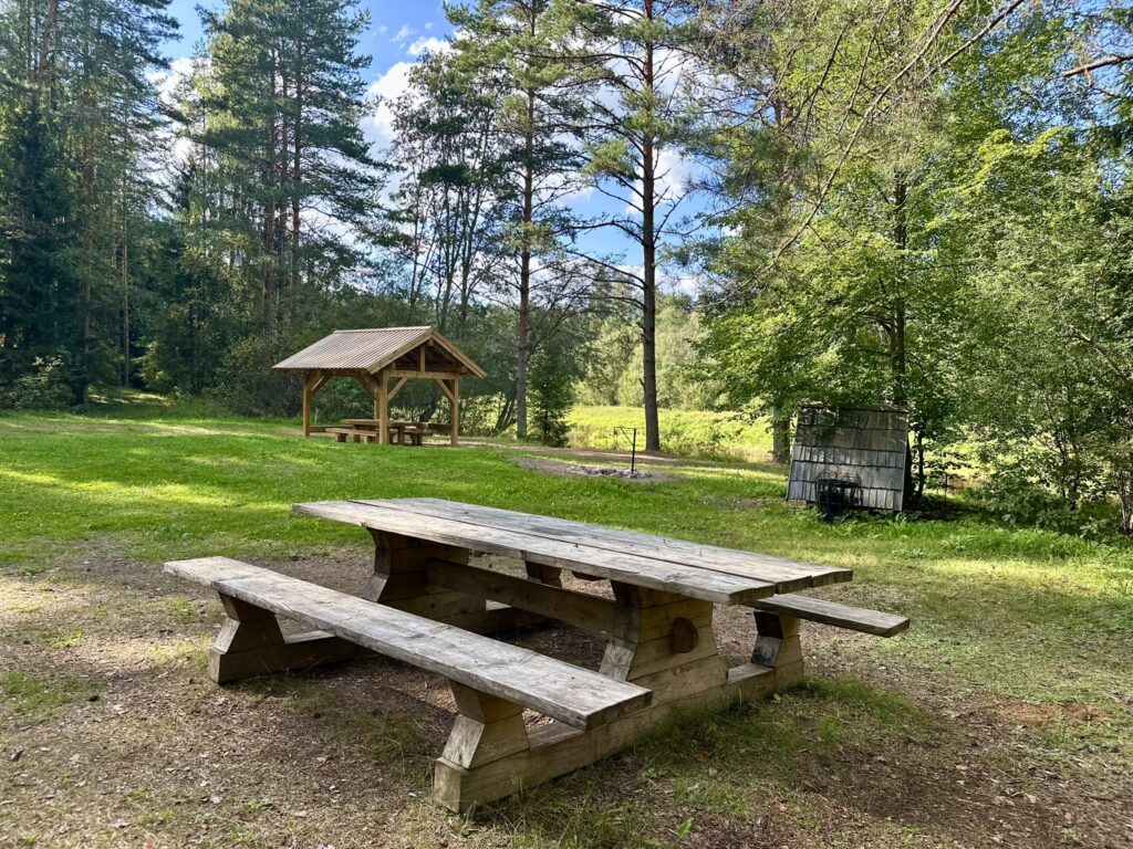 - Šeit pieejama koka lapene, galds, soli, iekārtotas ugunskura vietas un tualete.