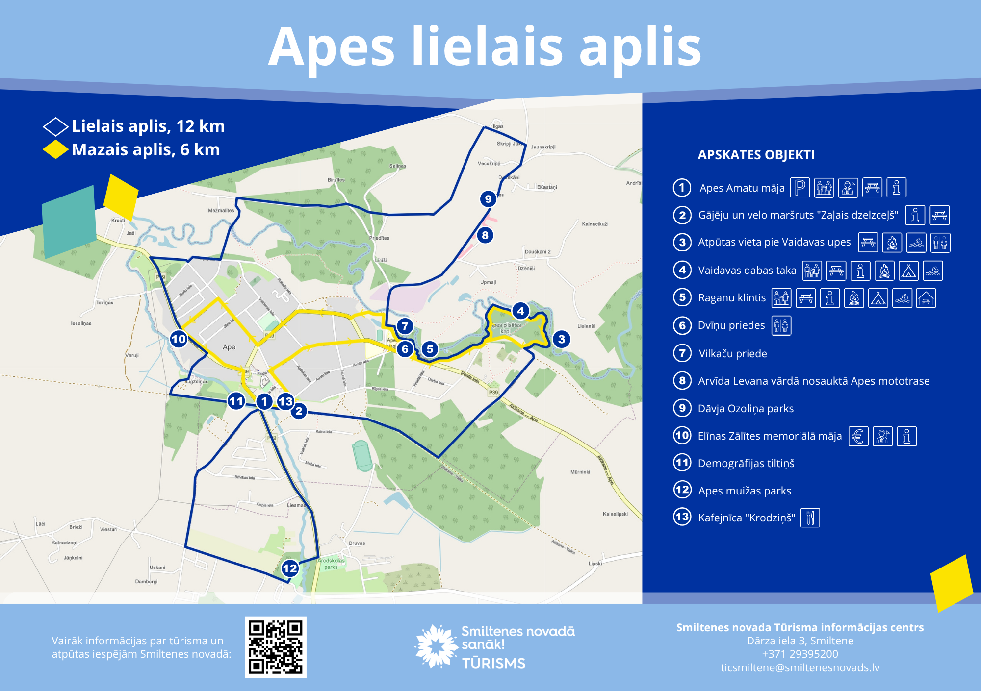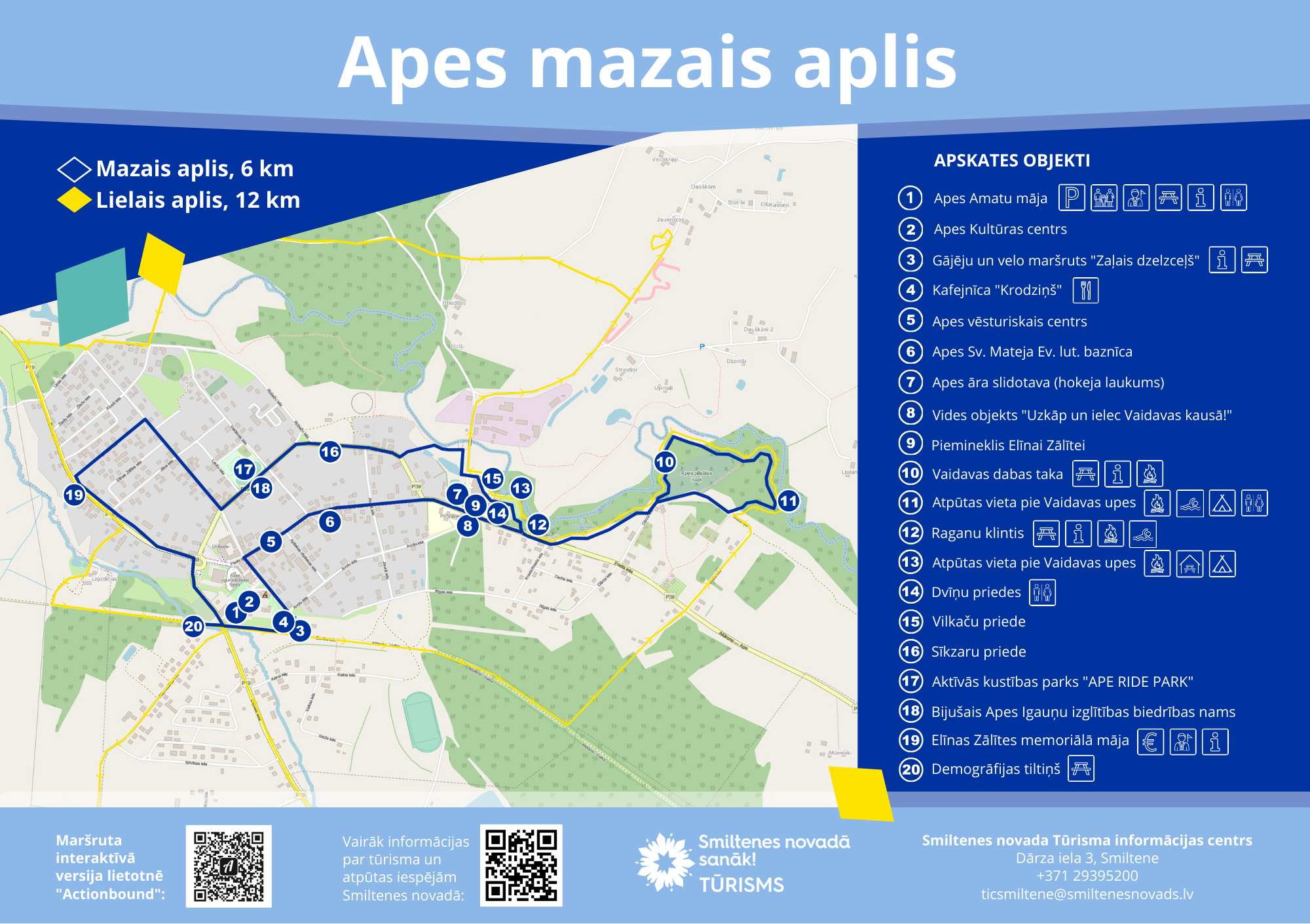Maršrutā iekļauti pieturas punkti: Elīnas Zālītes memoriālā māja; Dvīņu priedes; Vaidavas dabas taka; Apes Amatu māja; Demogrāfijas tiltiņš; Apes muižas parks; kafejnīca “Krodziņš”; gājēju un velo maršruts “Zaļais dzelzceļš”; Raganu klintis; Arvīda Levana vārdā nosauktā Apes mototrase; Dāvja Ozoliņa parks; Vilkaču priede; atpūtas vietas pie Vaidavas upes.