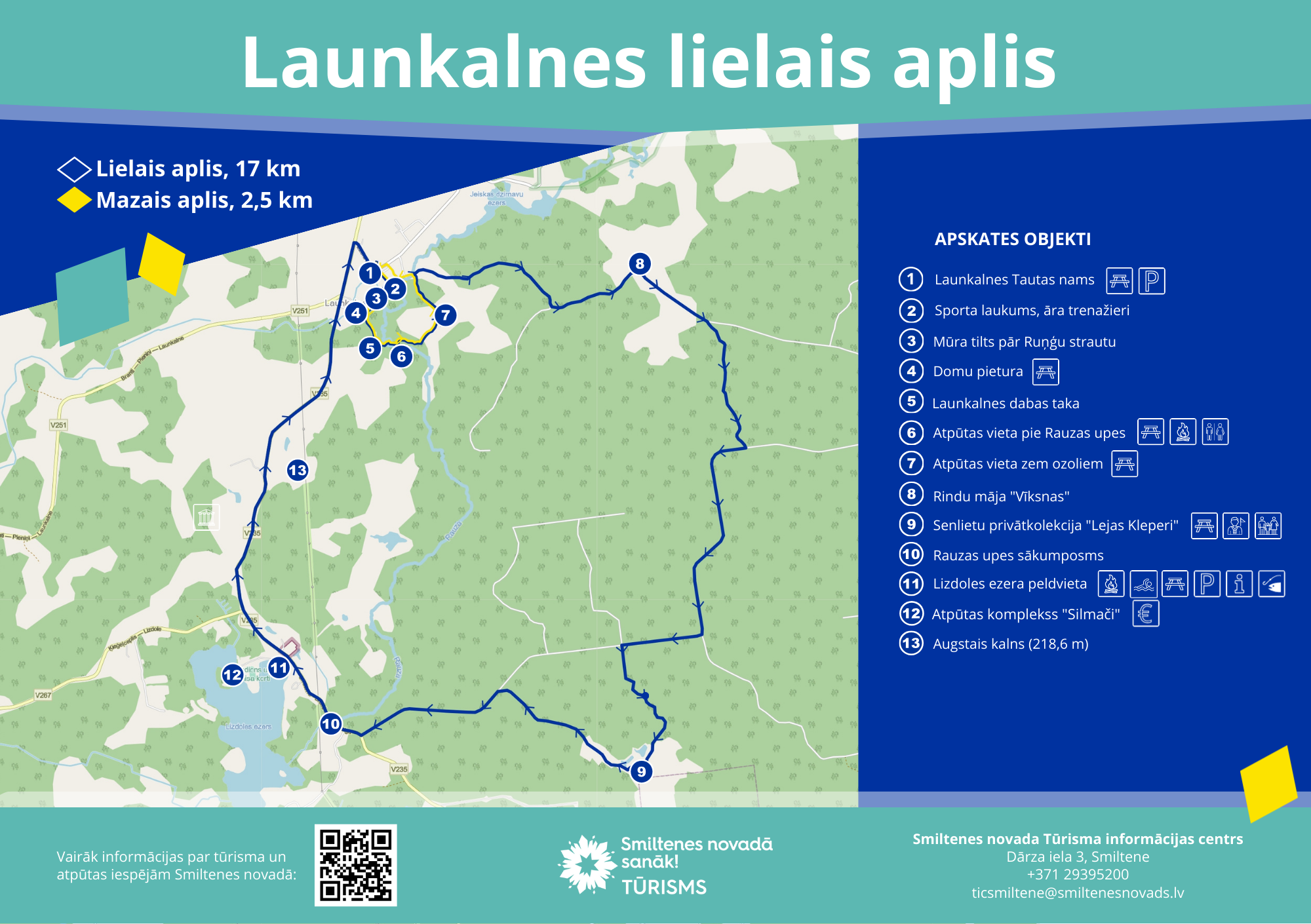 Maršrutā iekļauti pieturas punkti: Launkalnes Tautas nams (bijusī muižas kungu māja); mūra tilts pār Ruņģu strautu; dabas taka “Veļu kalni”; bijusī mežsaimniecības rindu māja “Vīksnas”; senlietu privātkolekcija “Lejas Kleperi” un Kleperu osis; Lizdoles ezers ar publisko peldvietu; atpūtas komplekss “Silmači” un bijušais slēpošanas kalns.