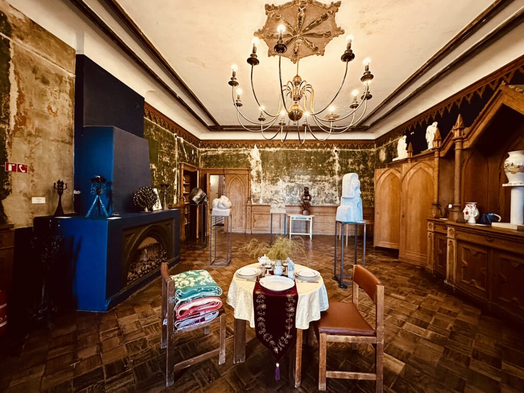 • Pils pirmajā stāvā atrodas deju zāle, muižas īpašnieku apartamenti, lielā ēdamzāle ar speciāli iebūvētām neogotikas mēbelēm un ēdamzāle, aiz kuras atrodas virtuve.